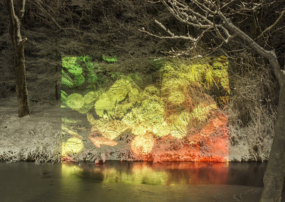 지호준 작가는 궁극적으로 보는 행위에 대한 새로운 차원의 사고를 이끌어내기 위해 사진예술의 진보된 패러다임으로 인정받는 ‘나노그래피 Nanography’ (Nano와 Photography의 합성어) 연작들을 선보이고 있다. 전자현미경으로 나노미터단위까지 확대 촬영하여 얻은 한지 이미지를 컴퓨터로 편집하고 채색작업을 거친 후, 건물이나 대자연과 같은 실제공간에서 투사하여 재촬영하는 방식을 취한다. 확대시킨 한지는 물줄기 같은 곡선이나 나무줄기처럼 보이는 직선, 그리고 수많은 점들로 이루어져 그야말로 종이 한 장에 자연 그대로를 펼쳐 놓고 있다. 홀로그램 혹은 증강현실을 연상시키는 작품은 현실과 가상의 경계를 넘나들며 몽환적인 분위기를 자아낸다. 우리가 흔히 아는 자연의 모습과 육안으로는 볼 수 없는 미지의 영역을 재구성한 자연의 모습을 한 프레임 안에서 볼 수 있는 창의적이고도 탁월한 작업이다.