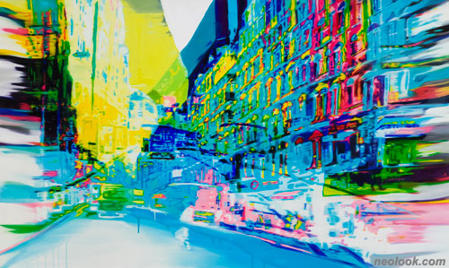 방법적으로 컴퓨터라는 현대적인 기계수단을 통해 리드미컬하게 흔들리고 그 흔들림으로 인한 비현실적인 공간에 드리워지는, 원색의 색채와 같이 현실의 변형이 이루어지고 현재의 풍경과 과거의 풍경의 조합이나, 시․공간의 대립을 주기도 하고 이러한 조합과 변형은 새로운 조화를 불러오며, 익숙한 풍경인 듯, 낯선 풍경을 만든다. 실재와 환영이 시간이 흐르듯, 어딘가로 흘러가듯, 빠져 들어가듯 정지되어 있던 공간을 움직이고 스쳐 지나가며 서로간의 충돌과 그 사이에서의 긴장감을 불러일으키며 이것은 새로운 현실로 일탈을 하는 것만 같다. 또한 대상을 옆으로 흩트려 트린 빠른 붓질의 의도적인 시각장 교란을 통해 화면에선 빠른 속도감 또한 느껴지며 화려한 스펙트럼 속에 갇혀버린 듯한 혼란한 도시 이미지로써 우리들의 일상적 관계와 무심코 지나는 현실의 단면을 낯설게 만나게 한다. ■ 윤혜정