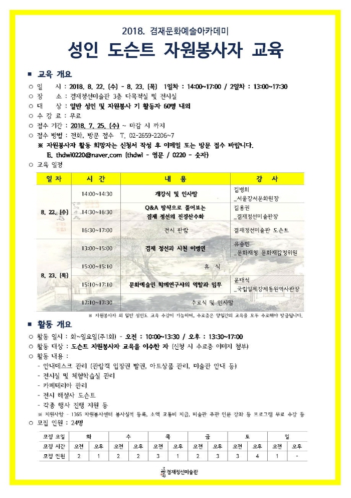 [겸재정선미술관] 2018. 성인 도슨트 자원봉사자 교육 페이지 정보 작성자 장희선 조회 10,654회 작성일 18-07-07 13:34 본문 ※ 자세한 사항은 미술관 홈페이지 공지사항(http://gjjs.or.kr) 확인 바라며, 많은 참여 부탁드립니다. 감사합니다. 추천 0 목록 이전글 [겸재정선미술관] 제7기 학생 도슨트 교육 18.07.07 다음글 [송은 아트스페이스] 도슨트 자원봉사자 모집 “전소정 : Kiss Me Quick” 17.04.26 장희선님의 인턴정보 관련글 인턴정보 더보기 H 인기글 [겸재정선미술관] 제7기 학생 도슨트 교육 07-07
