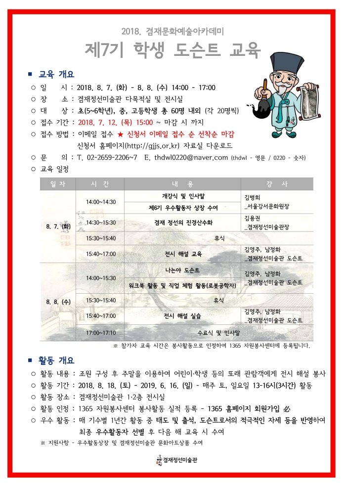 [겸재정선미술관] 제7기 학생 도슨트 교육 페이지 정보 작성자 장희선 조회 11,413회 작성일 18-07-07 13:35 본문 ※ 자세한 사항은 미술관 홈페이지 공지사항(http://gjjs.or.kr) 확인 바라며, 많은 참여 부탁드립니다. 감사합니다. 추천 0 목록 이전글 문화예술행사 보조인력을 모집합니다. 19.08.21 다음글 [겸재정선미술관] 2018. 성인 도슨트 자원봉사자 교육 18.07.07 장희선님의 인턴정보 관련글 인턴정보 더보기 H 인기글 [겸재정선미술관] 2018. 성인 도슨트 자원봉사자 교… 07-07