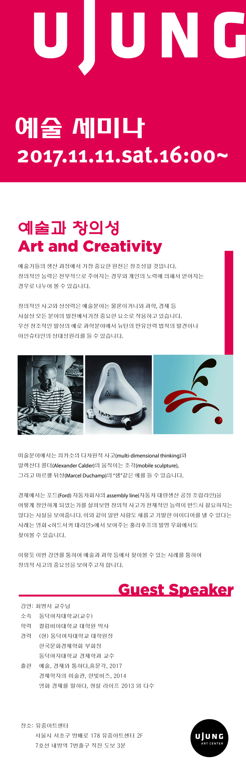 [유중갤러리] 예술과 창의성 : 최병서 교수님 예술 세미나 (11.11) 페이지 정보 작성자 uJung 조회 6,354회 작성일 17-11-08 10:53 본문 http://daljin.com/File/edtImg/66f2d25d_%25EA%25B5%2590%25EC%2588%2598%25EB%258B%2598%2B%25EC%2584%25B8%25EB%25AF%25B8%25EB%2582%2598-01%2528%25EC%2597%2585%25EB%25A1%259C%25EB%2593%259C%25EC%259A%25A9%2529.jpg">문의: 유중아트센터 02-3477-7727 추천 0 목록 이전글 KT 갤럭시 S9/S9+ 신규컬러(Red & Gold) 출시기념 이벤트 !! 18.06.01 다음글 [고양문화재단]2018 고양아티스트365 전시작가 공모 17.11.06