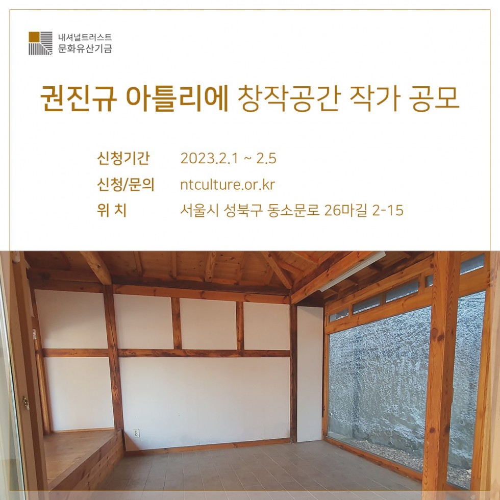 권진규 선생의 예술정신을 잇고, 예술가를 지원하기 위해 권진규 아틀리에에서 창작공간을 제공합니다. 많은 예술작가의 관심과 참여 부탁드립니다.