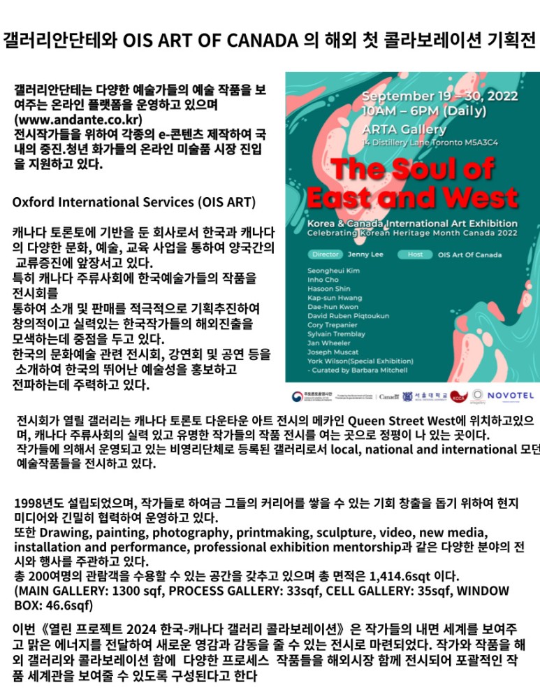 갤러리안단테는 다양한 예술가들의 예술 작품을 보여주는 온라인 플랫폼을 운영하고 있으며 (www.andante.co.kr) 전시 작가들을 위하여 각종의 e-콘텐츠 제작하여 국내의 중진.청년 화가들의 온라인 미술품 시장 진입 지원하고 있다. Oxford International Services (OIS ART) 캐나다 토론토에 기반을 둔 회사로서 한국과 캐나다 의 다양한 문화, 예술, 교육 사업을 통하여 양국 간의 교류 증진에 앞장서고 있다. 특히 캐나다 주류 사회에 한국 예술가들의 작품을 전시회를 통하여 소개 및 판매를 적극적으로 기획 추진하여 창의적이고 실력 있는 한국 작가들의 해외 진출을 모색하는데 중점을 두고 있다. 한국의 문화 예술 관련 전시회, 강연회 및 공연 등을 소개하여 한국의 뛰어난 예술성을 홍보하고 전파하는데 주력하고 있다. 전시회가 열릴 갤러리는 캐나다 토론토 다운타운 아트 전시의 메카인 Queen Street West에 위치하고 있으며, 캐나다 주류 사회의 실력 있고 유명한 작가들의 작품 전시를 여는 곳으로 정평이 나 있는 곳이다. 작가들에 의해서 운영되고 있는 비영리단체로 등록된 갤러리로서 local, national and international 모던 예술 작품들을 전시하고 있다. 1998년도 설립되었으며, 작가들로 하여금 그들의 커리어를 쌓을 수 있는 기회 창출을 돕기 위하여 현지 미디어와 긴밀히 협력하여 운영하고 있다. 또한 Drawing, painting, photography, printmaking, sculpture, video, new media, installation and performance, professional exhibition mentorship과 같은 다양한 분야의 전 시와 행사를 주관하고 있다. 총 200여명의 관람객을 수용할 수 있는 공간을 갖추고 있으며 총 면적은 1,414.6sqt 이다. (MAIN GALLERY: 1300 sqf, PROCESS GALLERY: 33sqf, CELL GALLERY: 35sqf, WINDOW BOX: 46.6sqf)ㅜ이번 은 작가들의 내면 세계를 보여주고 맑은 에너지를 전달하여 새로운 영감과 감동을 줄 수 있는 전시로 마련되었다. 작가와 작품을 해 외 갤러리와 콜라보레이션 함에 다양한 프로세스 작품들을 해외 시장 함께 전시되어 포괄적인 작품 세계관을 보여줄 수 있도록 구성된다고 한다.