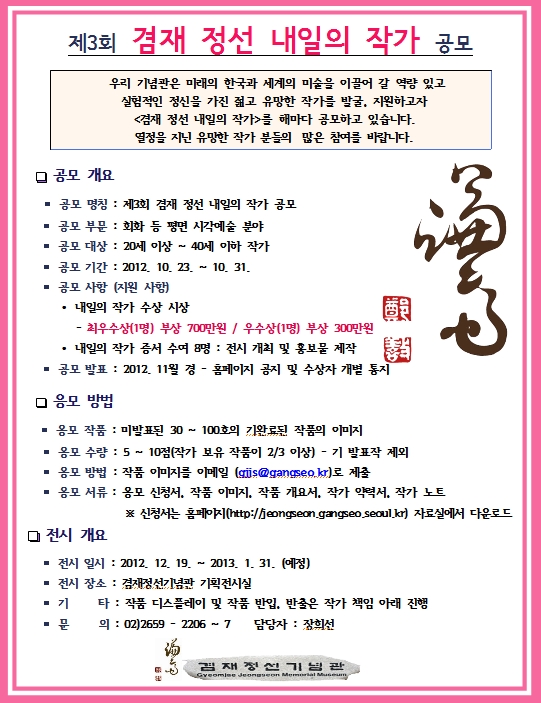 [겸재정선기념관] 제3회 내일의 작가 공모 안내문 페이지 정보 작성자 장희선 조회 7,377회 작성일 12-08-24 12:35 본문 많은 관심과 참여 부탁드립니다. 추천 0 목록 이전글 [겸재정선기념관] 제4회 겸재 학술논문 현상 공모 12.08.30 다음글 얀 샤우덱 사진전 연계 이벤트-사진특강,음악회 12.08.23 장희선님의 알림마당 관련글 알림마당 더보기 H 인기글 [겸재정선미술관] 2019. 제10회 겸재 내일의 작가… 07-12 H 인기글 [겸재정선미술관] 2019. 제10회 겸재 내일의 작가… 07-11 H 인기글 [겸재정선미술관] 제7기 학생 도슨트 교육 07-11 H 인기글 [겸재정선미술관] 2018. 성인 도슨트 자원봉사자 교… 07-11 H 인기글 [겸재정선미술관] 제2기 겸재 홍보 서포터즈 활동단 모… 12-06 H 인기글 [겸재정선기념관] 제10회 겸재사생대회(5.24일) 05-09 H 인기글 [겸재정선기념관] 제 4회 겸재 학술논문 현상 공모 02-13 H 인기글 [겸재정선기념관] 제4회 겸재 학술논문 현상 공모 08-30