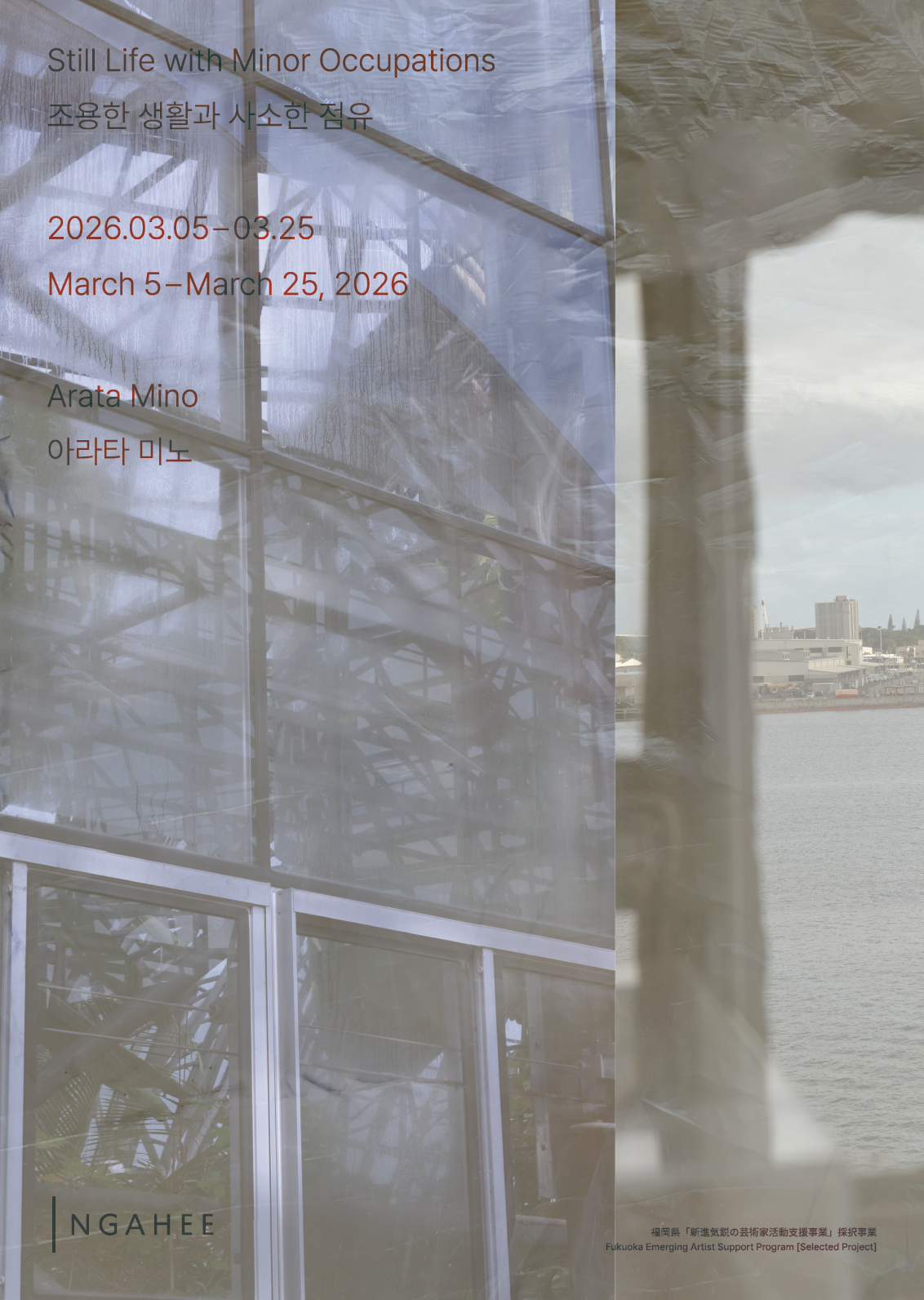 아라타 미노의 개인전 《조용한 생활과 사소한 점유》(Still Life with Minor Occupations)는 도자기 인형 설치 작업 〈사소한 점유〉, 한국과 일본의 역사적 풍경을 담은 사진 시리즈 〈해안에서의 시선〉(Perspective on the Shore)과 〈온실로부터 바다에〉, 그리고 퍼포먼스 영상 〈숨을 이어가다〉(One Breath Followed by Another)를 함께 선보인다. 다양한 매체로 구성된 이 작업들은 하나의 전시 공간 안에서 교차하며, 물질과 신체, 그리고 시선의 층위를 통해 우리가 서 있는 세계의 구조를 드러낸다.