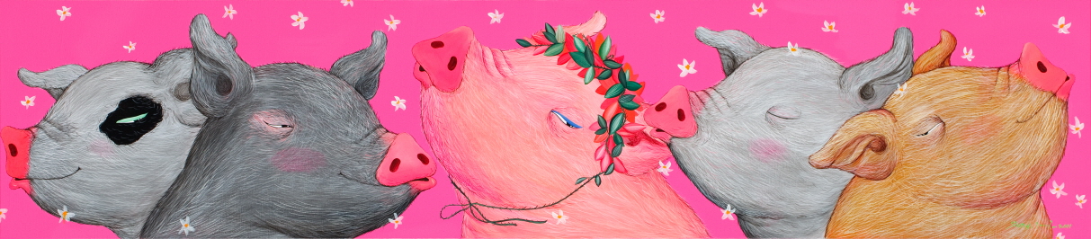 대한민국은 급속한 경제 성장고도를 경험한 나라중의 하나로써, 아직까지도`빈부의차=계급의차`를 절실히 느낄 수 있 철저한 물질문명 사회이기도 하다. 쇼핑 카트 안에 대량생산된 물건처럼 쌓아진 돼지나, 축 늘어져 생기가 없는 돼지, 와인을 마시며 누워있는 돼지, 해드폰을 끼고 콜라를 마시는 돼지들의 군상은 쇼핑시대, 즉 소비시대에 살고 있는 무기력한 우리들의 모습을 대변하고 있다. 또한, 빨간 망또를 두르거나, 손오공이나 베트맨등의 의상을 걸친 돼지들은, 히어로를 연상 시키는 복장과는 어울리지 않게, 목표를 잃어버린 채 쇼핑카트 안에 몸을 내 맏겨 버렸다. 이러한 형상은 아직도 성장 과도기에 위치한 대한민국이란 배경에서 어쩌면 필연적으로 다루어 질 수밖에 없 문제점 일 수도 있겠다. 그렇지만 작가는 세상에 대한 비판적인 표현, 부조리한 인간의 암울한 현실을, 그녀만의 독특한 유머를 통한 전달 양식을 통해 `포지티브`로 전환해 간다. 그녀의 작품은 현실과 상상의 세계를 넘나들며 웃음을 선사하고, 단절되고 썩은 세상을 향해 건배를 청하는 여유마저 보여 주는 듯 하다. 작가가 지닌 이러한 요소에는 한국인 특유의 해학적 기질이 내재되어 있다. 계급사회를 살던 우리조상들은 가면극을 통해 세상을 풍자하고 웃음으로 승화시킴으로 삶에 대한 강한 의지를 잃지 않았다. 현실에 대한 통렬한 풍자는, 삶에 대한 강한 집착이기도 하다. 임성희의 작품은 어디까지나 상상으로의 도피가 아닌 미래 지향적이다. 그리고 그것은 현실을 직시하고 받아들인 후 에야 가능해 진다.
