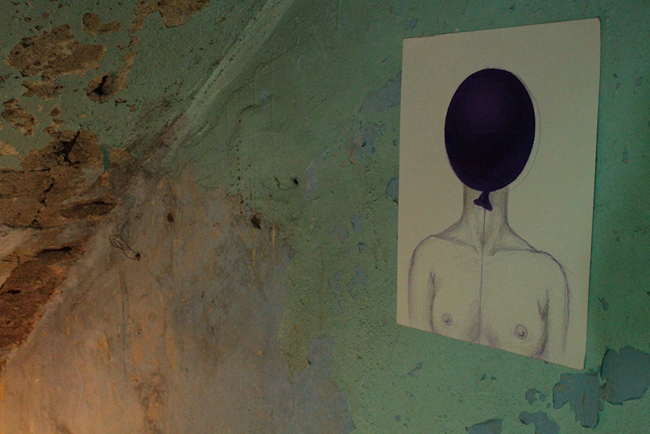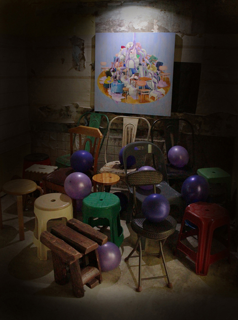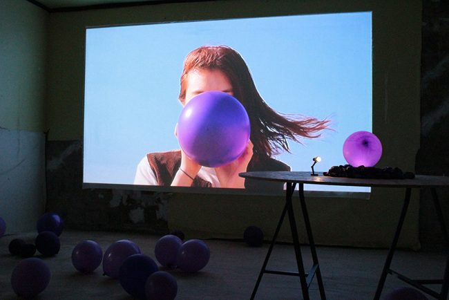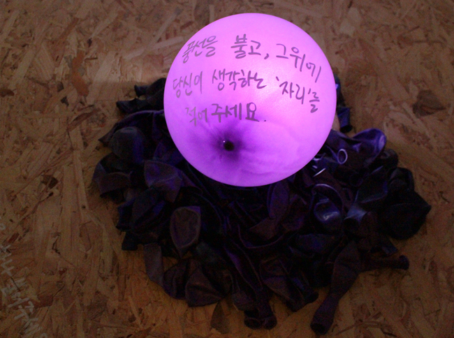 박민경 _ 자리를 위한 식탁 _ Balloon, Paint Pen, Wooden Table _ Dimensions Variable _ 2018