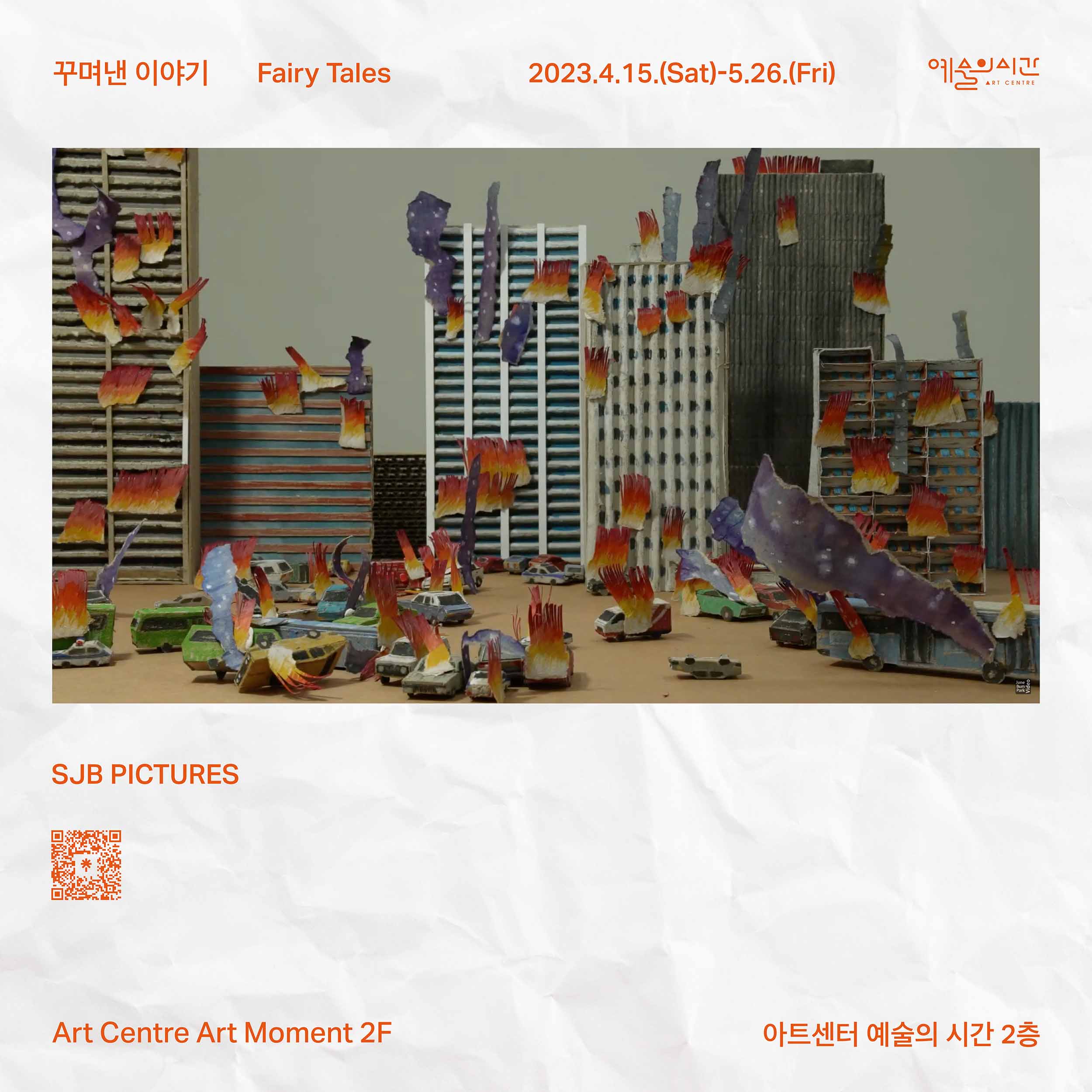 작성자 106 조회 9,157회 작성일 23-04-10 16:13아트센터 예술의 시간은 2023년 4월 15일부터 5월 26일까지 SJB PICTURES(에스제이비 픽쳐스)의 개인전 《꾸며낸 이야기》를 개최한다. SJB PICTURES(노상준x박준범)는 ‘꾸며낸 이야기’ 시리즈 중 5개의 영상 작품 〈불타는 도시〉, 〈과적선〉, 〈착륙〉, 〈웅덩이〉, 〈종이손〉을 전시한다. ‘꾸며낸 이야기’는 미디어를 통해 바라보는 전쟁과 재난, 사고의 참상이 빈번하게 일상적으로 소비되면서 오히려 비현실적 광경이나 이미지로 증발해버리는 실상에 관한 이야기다. 작가가 조작한 이야기의 세계는 실제로 벌어지고 있는 참혹한 재난의 실상과 묘하게 중첩된다. 《꾸며낸 이야기》는 스펙터클한 광경을 담은 흥미로운 이야기에 머무르지 않고, 그 안에 가려진 고통의 문제를 넌지시 드러내는 것으로 이야기의 한계를 넓힌다. 그리고, 모든 것을 순식간에 엔터테인먼트로 만들어버리는 문화와 세태가 시대의 고통을 담은 뉴스와 이미지에조차 영향을 끼치는 지금의 모습을 반영한다.