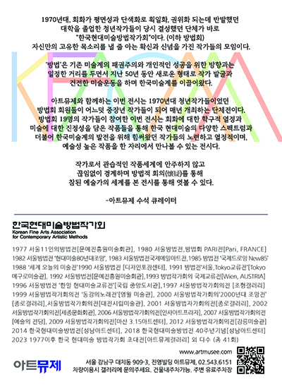 아트뮤제와 함께하는 이번 전시는 1970년대 청년작가들이었던 방법회 회원들이 어느덧 중장년 작가들이 되어 매년 개최하는 단체전이다.