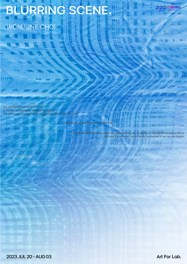 아트 포 랩(Art For Lab.)은 경기도와 경기문화재단이 주최 및 후원하는 ‘2023 경기예술지원’의 <경기예술 생애 첫 지원>에 선정된 최원준 작가의 개인전 《Blurring Scene》을 오는 7월 20일(목)부터 8월 3일(목)까지 개최한다.