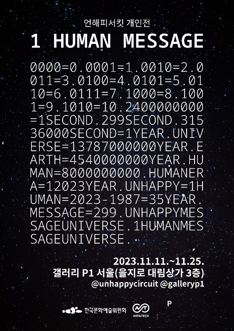 프로젝트 <1 HUMAN MESSAGE>는 한 인간이 살아온 ‘시간’에 대한 짧은 기록이자 데이터인 <1 HUMAN MESSAGE>를 광대한 우주에 남기기 위한 다원 우주예술 프로젝트이다. 언해피서킷은 직접 제작한 이동식 우주 데이터 송신 장치를 가지고 지구 곳곳을 다니며 우주를 향해 메시지를 전송하는 작업을 수행한다. 이는 곧 자신의 흔적을 우주에 남기기 위함이자 본질적으로 유한하고 외로운 우리 인간의 삶과 정신을 우주와 연결하기 위한 한 인간의 여정이다.