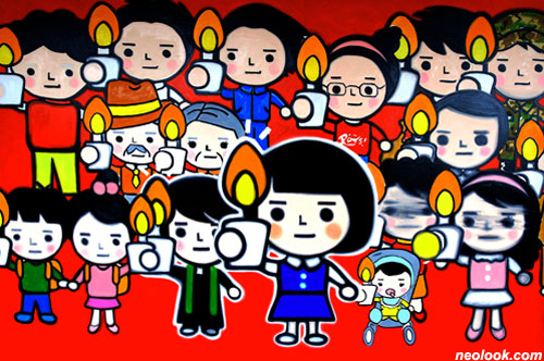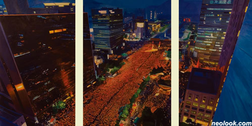 ● 다른 작품 설명도 부탁드릴게요, 『잘가요』 라는 작품에서 배경은 인왕산이고 앞의 성은 경복궁, 청와대를 뜻하죠. 그림 속 공간은 노무현 전 대통령의 영구차가 지나간 자리에요. 그 자리에서 사람들이 작별인사를 하는 모습이죠. 그래서 제목을 『잘가요』라고 지었어요. 이 그림에서 힌트는 산이에요. 인왕산 줄기를 사실적으로 묘사하려고 노력했거든요. 『2008년 6월 10일 내 컴퓨터 바탕화면』 이 작품은 6개월 동안 그린 아주 공들인 그림이에요. 6월 항쟁 20주년 기념과 소고기 수입 반대 100만인 시위가 있었던 현장의 모습입니다.