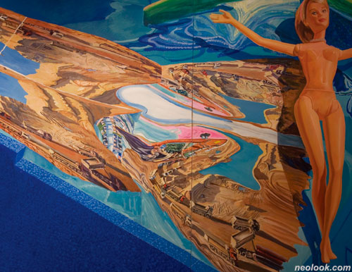 그 뉴스 사진 자체를 그림에 담았고 오른쪽에 바비 인형은 십자가에 박힌 공주의 모습입니다. 충남 공주(公州)를 공주(公主)의 이미지로 비유한 것이죠. 그림 왼쪽 부분에 나의 분신이고 꿈속의 이야기, 나의 희망 같은 이야기들을 요정에 담았습니다. 그리고 이 요정들이 강과 물고기들 모래들을 보호해 주는 심정을 이야기한 거죠. 이 레고나 요정들이 포크레인을 무찔러 줄 것 같지 않나요? 하하하