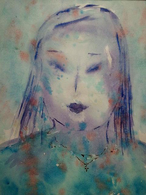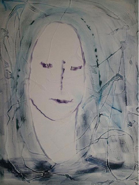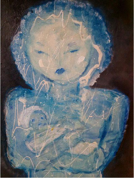 “Asian Madonna.” This is oil in various shades of blue with a faint outline of baby Jesus in her arms.